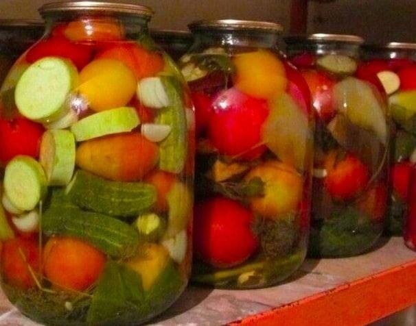 ✔ Что потребуется: На 1 литр воды 5 столовых ложек сахара, 2 столовых ложки соли. 60-70г уксуса 9%. ГОТОВИМ: В банку на дно кладу лист хрена, мелко порезанный корень хрена, перец горошком,зонтики укропа, раскладываю овощи:помидоры, огурцы, болгарский перец,лук, кабачки, чеснок и кладу петрушку, листья смородины,веточки базилика. Заливаю кипятком на 30 минут, затем сливаю и делаю рассол. Заливаю кипящим рассолом, добавляю уксус и закатываю. Укутываю.