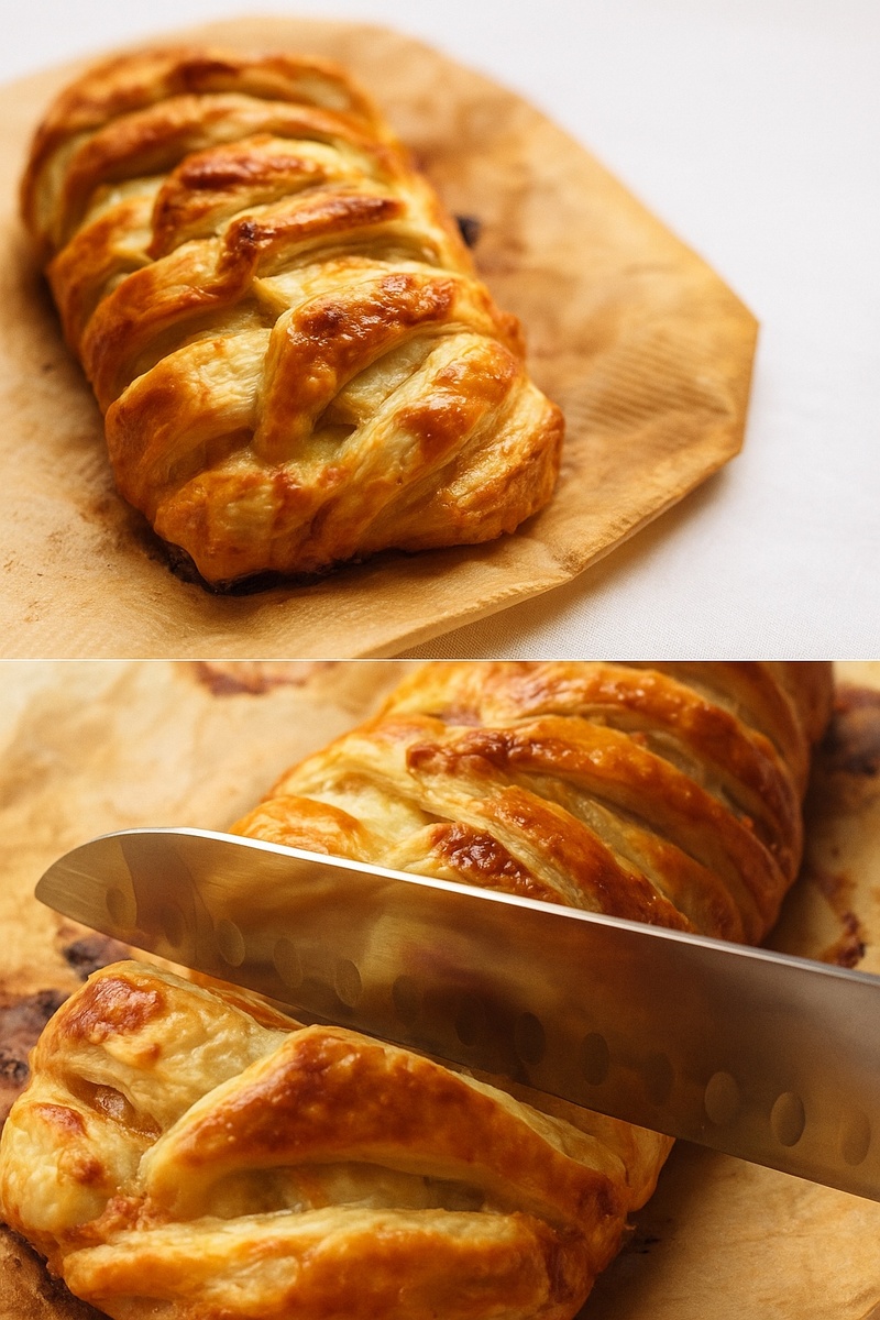 Аппетитный слоеный рулет с сочной куриной начинкой и тянущейся сырной начинкой - идеальное блюдо для сытного ужина! Хрустящая золотистая корочка и ароматная мясная сердцевина покорят всю семью. Ингредиенты: - 400 г слоеного теста - 400 г куриного фарша - 1 крупная луковица - 1 яйцо - 2 ст.л. сметаны - 1 ст.л. соевого соуса - 100 г моцареллы для пиццы - 1 желток для смазывания - Соль, перец по вкусу Приготовление: 1. Разморозьте тесто при комнатной температуре, аккуратно соедините пласты руками (не раскатывайте скалкой). 2. Сделайте диагональные надрезы по краям теста с двух сторон ("ёлочка"). 3. Для начинки смешайте фарш, мелко нарезанный лук, яйцо, сметану, соевый соус, соль и перец. 4. Выложите начинку по центру теста, сверху распределите натертую моцареллу. 5. Смажьте края желтком, переплетите "косы" из надрезанных полосок. 6. Смажьте поверхность желтком, выпекайте при 180°C 1 час 10 минут до румяной корочки.