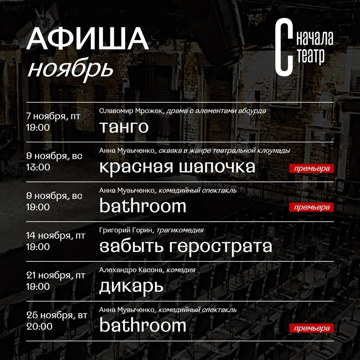 Делимся с вами репертуаром на ноябрь☂️ Погода с каждым днём всё хуже, а уже завтра наступит последний месяц осени. Ждём вас на наших спектаклях, будем греться вместе! 🎟️Билеты на сайте: snachalateatr.ru