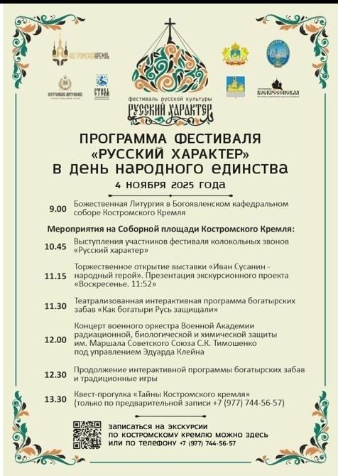4 ноября Соборная площадь кремля превратится в живую площадку истории, музыки и традиций В День народного единства костромичей и гостей областной столицы ждет большой праздник в сердце города. На Соборной площади Костромского кремля пройдет фестиваль «Русский характер», объединяющий силу народных традиций, историю и атмосферу единства. Программа обещает быть насыщенной и по-настоящему праздничной. Гостей ждет выступление звонарей, театрализованные богатырские забавы «Как богатыри Русь защищали» и выставка «Иван Сусанин — народный герой». На площади выступит военный оркестр под управлением Эдуарда Клейна. Для любителей истории подготовлена квест-прогулка «Тайны Костромского кремля», на нее необходимо предварительно записаться. Праздник начнется в 9.00 Божественной Литургией в Богоявленском Кафедральном Соборе кремля и продлится до вечера.