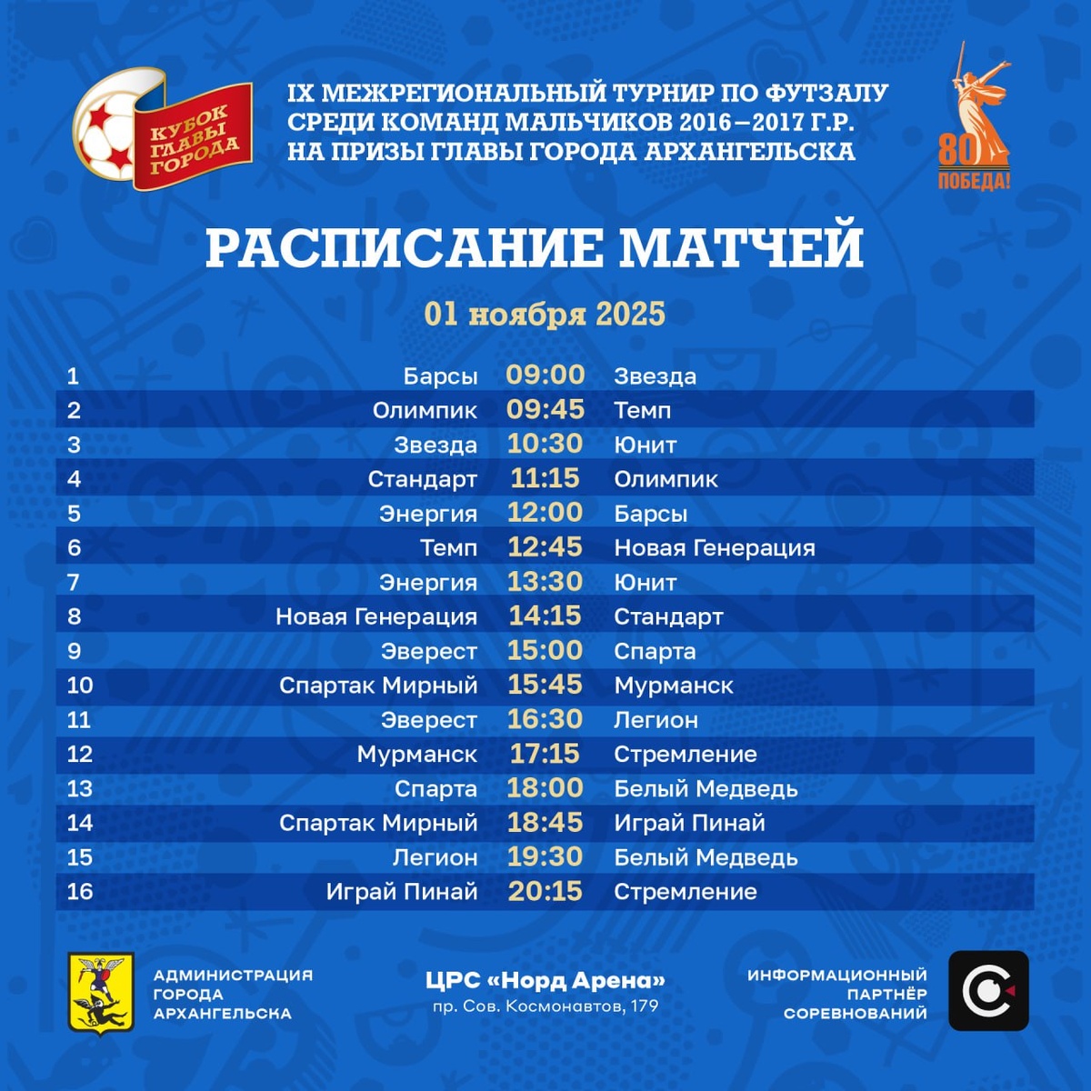 ⚽️⚽️ Кубок главы города Архангельска | 2025 ⚽️ Расписание первого дня соревнований 01.11.2025 09:00 ⚽️ 4 х 0 ⚽️ 📺 Трансляция 09:45 ⚽️ 15 х 0 ⚽️ 📺 Трансляция 10:30 ⚽️ 7 х 2 ⚽️ 📺 Трансляция 11:15 ⚽️ 4 х 3 ⚽️ 12:00 ⚽️ 0 х 9 ⚽️ 📺 Трансляция 12:45 ⚽️ 0 х 9 ⚽️ 📺 Трансляция 13:30 ⚽️ 0 х 10 ⚽️ 📺 Трансляция 14:15 ⚽️ 2 х 2 ⚽️ 📺 Трансляция 15:00 ⚽️ 0 х 1 ⚽️ 📺 Трансляция 15:45 ⚽️ 6 х 0 ⚽️ 📺 Трансляция 16:30 ⚽️ 0 х 2 ⚽️ 📺 Трансляция 17:15 ⚽️ 0 х 3 ⚽️ 📺 Трансляция 18:00 ⚽️ 7 х 0 ⚽️ 📺 Трансляция 18:45 ⚽️ 20 х 0 ⚽️ 📺 Трансляция 19:30 ⚽️ 7 х 1 ⚽️ 📺 Трансляция 20:15 ⚽️ 1 х 5 ⚽️ 📺 Трансляция