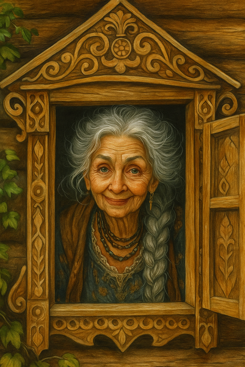 Статная женщина с седыми кудрями, заплетёнными в свободную косу. В её ясных глазах живёт вековая мудрость, а на губах — хитроватая улыбка. Она ворчит и шутит, но за этим — тепло, забота и умение видеть больше, чем видят другие.