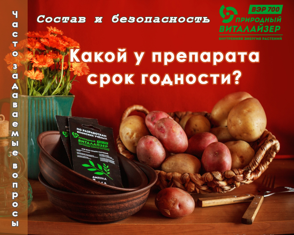 🌱Ответ специалиста: Да, как и у любого высокоактивного биопродукта, у «Виталайзера ВЭР-700» есть срок годности. Срок годности: Составляет 2 (два) года с даты производства, которая указана на упаковке и флаконе. Условия хранения: Для сохранения эффективности препарата на протяжении всего срока годности необходимо соблюдать простые правила: Хранить в оригинальной неповрежденной упаковке. Место хранения должно быть защищено от прямых солнечных лучей. Оптимальный температурный режим — от 0°C до +25°C. Не допускайте замораживания препарата. Обязательно хранить в месте, недоступном для детей и животных. Рекомендация: После вскрытия флакона желательно использовать его содержимое в течение сезона. Перед каждым использованием взбалтывайте флакон для обеспечения однородности концентрата. Если препарат немного загустел, потеряв влагу, его можно развести несколькими каплями воды и после использовать.