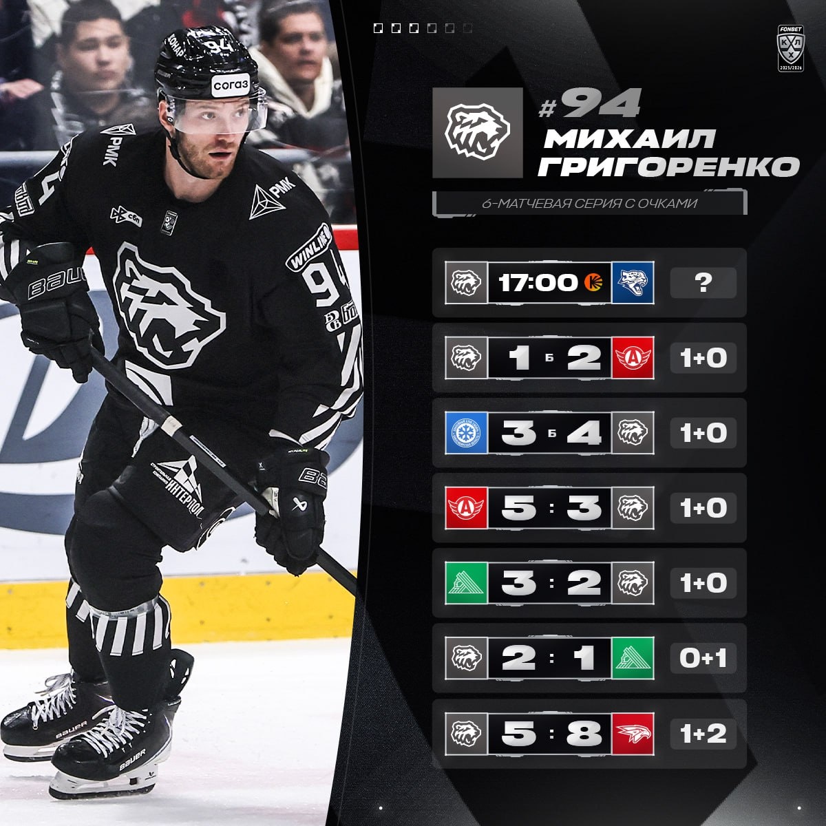 Михаил Григоренко во второй раз в сезоне выдал 4-матчевую голевую серию, а к игре с «Барысом» подходит с 6-матчевым результативным отрезком (личный рекорд за два года). Сможет ли #94 набрать очки сегодня вечером? 🚜 x 🇰🇿 17:00 мск 🍿