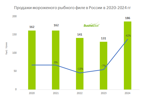 По данным «Анализа рынка мороженого рыбного филе в России», подготовленного BusinesStat в 2025 г, в 2024 г его продажи в стране увеличились на 42% и достигли 186 тыс т.