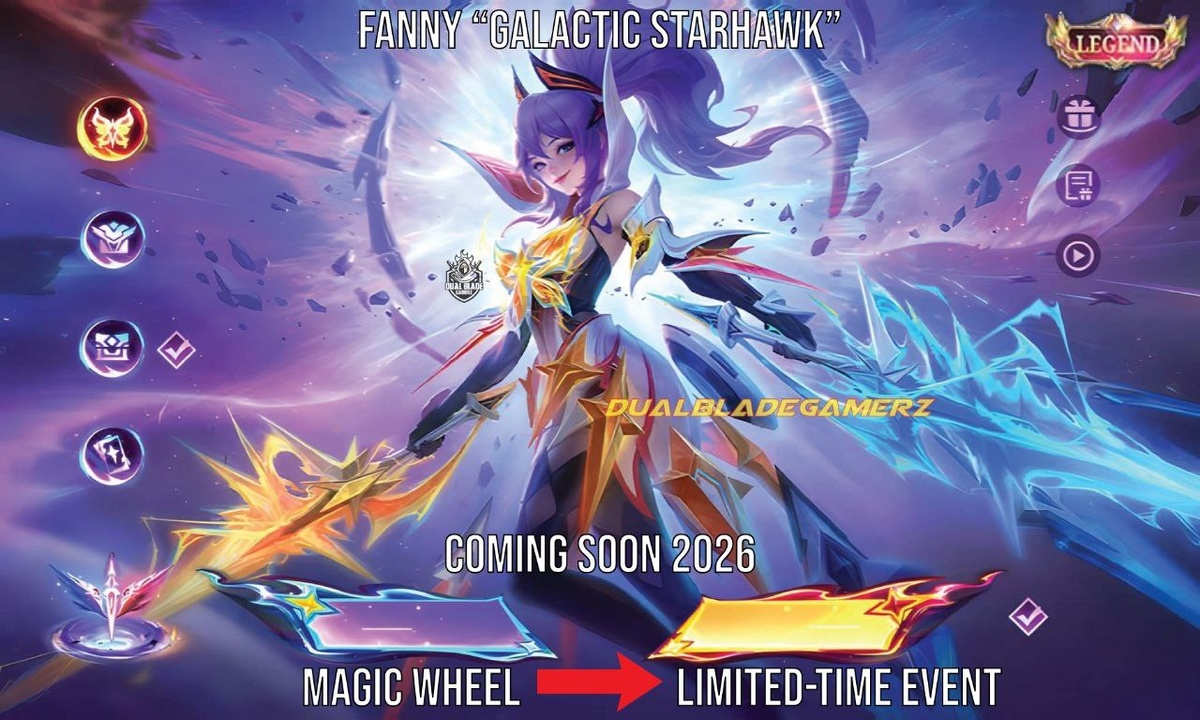 Legend Fanny — Galactic Starhawk Изначально легендарный скин Fanny: Galactic Starhawk планировался к выходу через Magic Wheel, но разработчики изменили планы — теперь он появится как временный ивентовый легендарный скин. Также сообщается, что Magic Wheel получит крупное обновление, чтобы будущие ревампы легендарных скинов проходили без проблем. Ожидается, что Legend Fanny выйдет в следующем году, во время «Золотого месяца». Выгодно и быстро пополнить алмазы Вы можете в нашем боте: @OneTwoPay_bot 🌟 Mobile Legends: Bang Bang