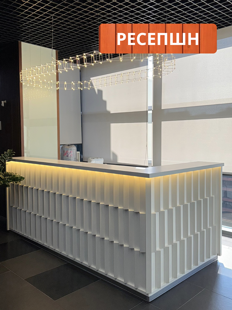 Мы изготовили стойку ресепшн, которая объединяет строгую геометрию, функциональность и стиль 🫰🏾 Корпус выполнен из высококачественного МДФ с матовым покрытием, фасад оформлен объёмными вертикальными элементами, создающими выразительный ритм. Нам приятно быть частью проекта, где дизайн и функциональность работают на общую идею — доверие, стабильность и современный взгляд на бизнес. 💌 Хотите индивидуальный проект для вашего бизнеса? Свяжитесь с нами – мы подготовим расчёт и создадим решение под ваши задачи!
