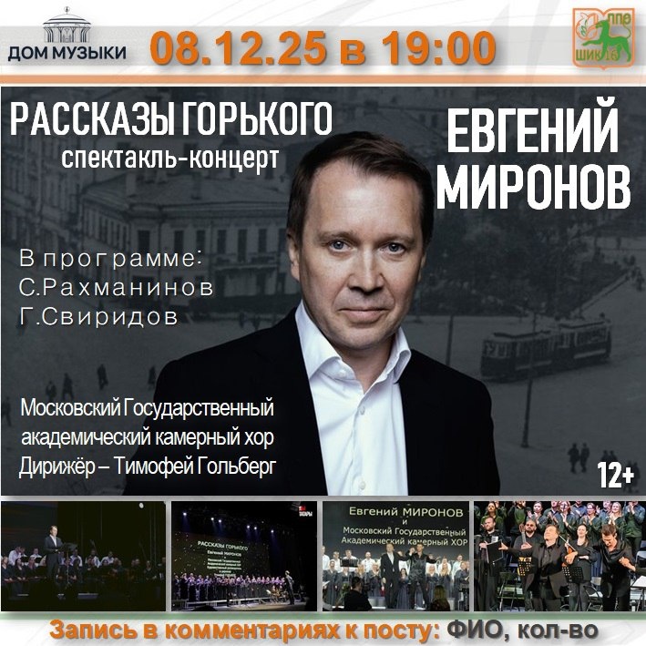 🔥🎭 Готовьтесь к грандиозной ПРЕМЬЕРЕ от Театра Наций! Уникальный театрально-музыкальный спектакль-концерт «Рассказы Горького» с неподражаемым Евгением Мироновым и Московским камерным хором имени Минина!💫🎶 Это вечер, где слово, музыка и эмоции сливаются в незабываемую симфонию искусства!✨🎵 Евгений Миронов вдохнёт новую жизнь в шедевры Максима Горького — «Макар Чудра» и «Старуха Изергиль».🌟 Это истории о страсти, свободе и душе, которые зазвучат с особой силой и глубиной. ❤️🔥 Камерный хор создаст волшебную атмосферу, исполняя народные мелодии и великие произведения Рахманинова и Свиридова. 🎼🌍 Спектакль — сочетание выразительного чтения, живой музыки и сильной драматургии! 🌹 📅 8 декабря (пн) 📍 Дом музыки 🎫 Билеты от 2.500 до 12.500 рублей Не пропустите это волшебное событие! 💖🎟️ Пойдёте? 😊