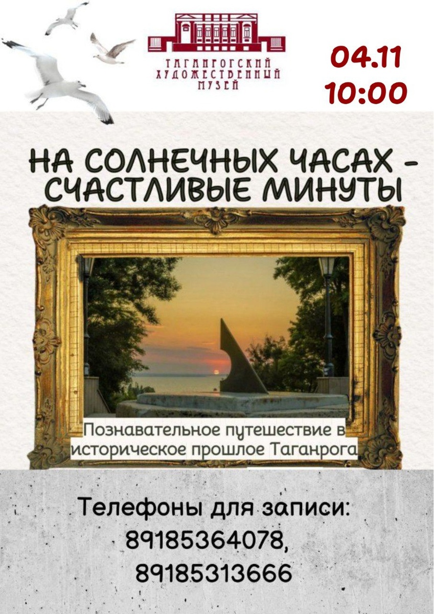 ☀ Дорогие друзья! По многочисленным просьбам, 4 ноября в 10:00 состоится пешеходная экскурсия «На солнечных часах — счастливые минуты». 🗺 Маршрут экскурсии проходит по Александровской улице, Итальянскому переулку, улице Греческой и Октябрьской площади. Прогулка по старинным улочкам города откроет перед вами удивительные станицы истории Таганрога. 🏛Старт экскурсии: Александровская, 56. ☎ Запись по телефону: +79185364078, 89185313666.