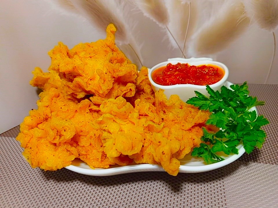 Филе куриной грудки 400г. Для кляра: 170 г муки, 2 ч.л. соли, 1 ч.л. черного молотого перца, 2 яйца, 200 мл чуть теплой воды, 3 ч.л. сладкой паприки.