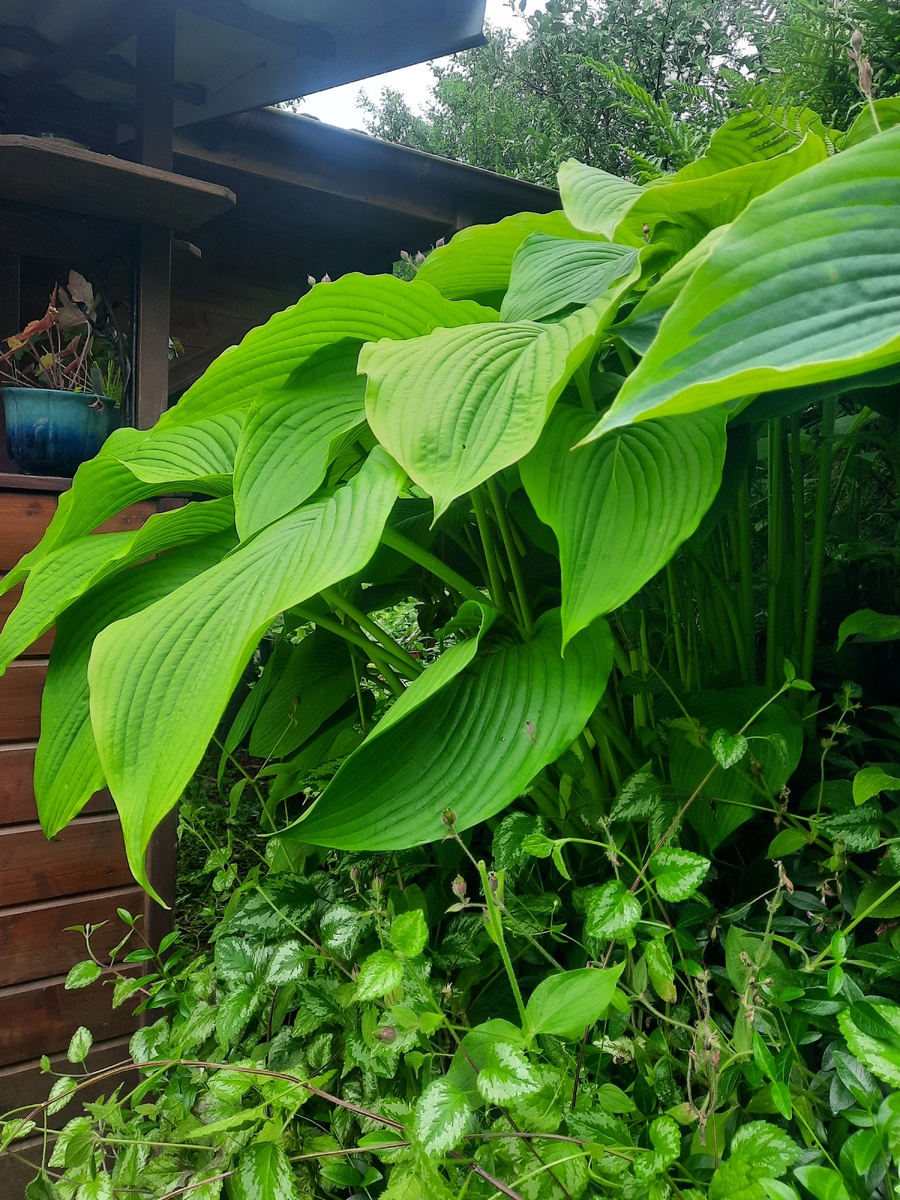 Здесь сразу несколько гигантских хост. Все растут в саду хост, третий ярус. Почва... Нет почвы, глина. Уход минимальный.
