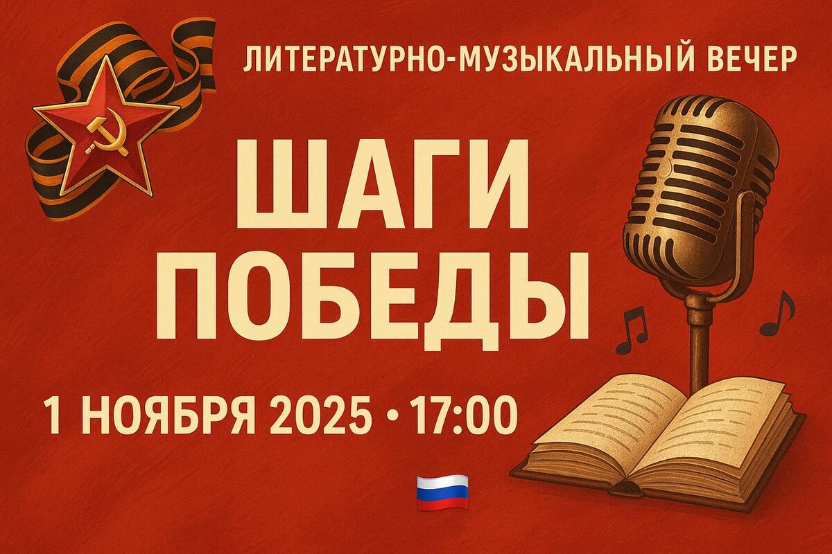 🎖 Литературно-музыкальный вечер “Шаги Победы” 🇷🇺 📍 Детская библиотека №228 (ОКЦ СЗАО) ул. Планерная, д. 7, корп. 1, Северное Тушино 🗓 1 ноября 2025 🕔 17:00–18:00 💥 Вход свободный | ☎️ +7 (495) 494-21-56 🔗 Регистрация ✨ В рамках акции #НочьИскусств в библиотеке №228 пройдёт литературно-музыкальный вечер “Шаги Победы” — посвящение искусству военного времени и подвигу народа! 📚 Вас ждёт: 🎤 Концертная программа от творческого коллектива “Вдохновение” под руководством Галины Анатольевны Галченковой — певицы, композитора и лауреата международных и всероссийских конкурсов. 💫 Прозвучат стихи и песни военных лет, наполняющие сердце гордостью и благодарностью. ✉️ Мастер-класс “Солдатский треугольник” — сделайте своими руками фронтовое письмо, как в годы Великой Отечественной войны. Все написанные письма будут переданы военнослужащим на СВО — знак памяти и поддержки! Приходите всей семьёй — ощутите силу искусства и благодарности, объединяющую поколения! #ШагиПобеды #НочьИскусств
