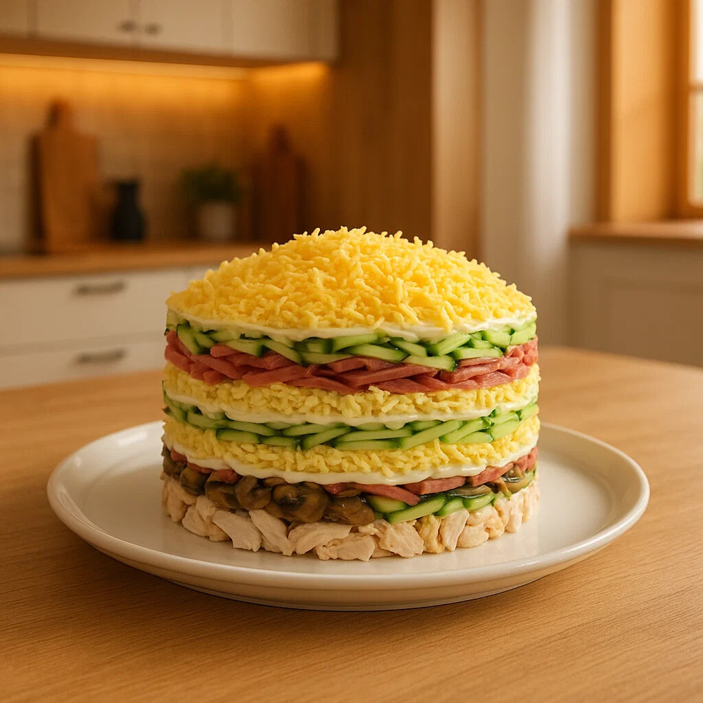 🥗 Слоёный салат с курицей и копчёностями — любовь с первой ложки! ❤️ Нежная курочка, сочные огурцы, ароматные грибочки, сыр и пикантные копчёности — этот салат всегда в центре внимания. Он выглядит празднично и на вкус просто божественный! ✨ 🛒 Ингредиенты (по слоям): Куриное филе (отварное, нарезанное соломкой) + майонез 🍗 Жареные грибы с луком + майонез 🍄🧅 Яйца варёные (2 шт, тёртые на мелкой тёрке) 🥚 Свежий огурец (соломкой) + майонез 🥒 Копчёное мясо или колбаса (мелко соломкой) 🥩 Яйца варёные (ещё 2 шт, тёртые) + майонез 🥚 Свежий огурец (нарезанный или тёртый) 🥒 + Сыр (натёртый на мелкой тёрке) 🧀 👨🍳 Приготовление: 1. Подготовьте все ингредиенты: отварите филе и яйца, обжарьте грибы с луком, нарежьте огурцы и копчёное мясо. 2. Соберите салат слоями (в кольце или на плоском блюде), каждый слой слегка промазывая майонезом. 3. Завершите сырной «шапочкой». 4. Уберите в холодильник минимум на 2 часа, чтобы слои хорошо пропитались. ❄️ В итоге получается нежный, сочный и
