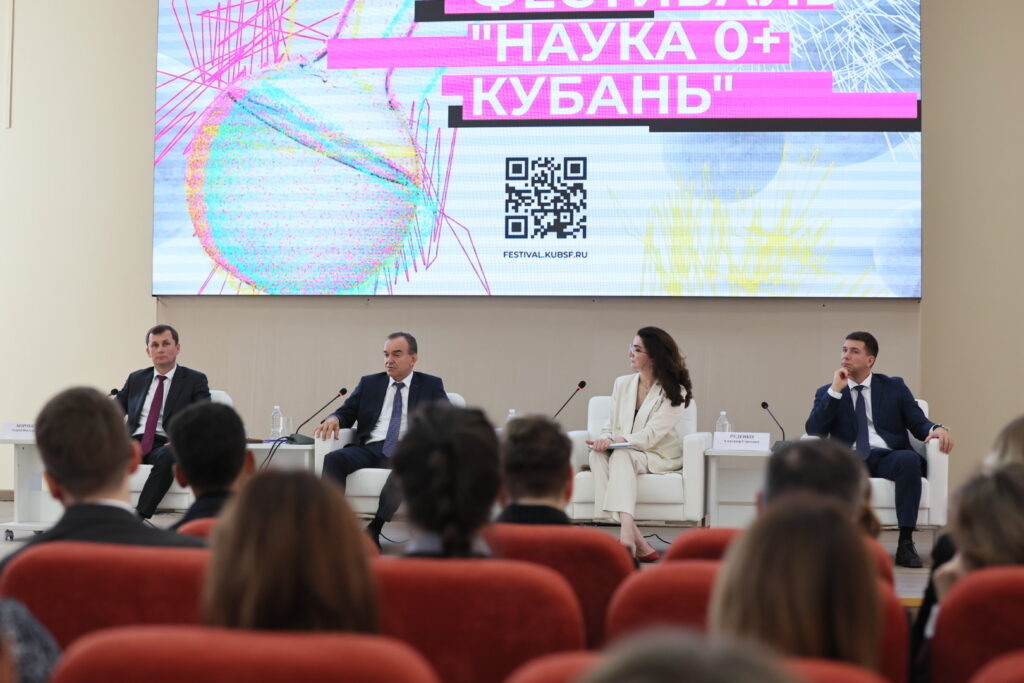 Губернатор Кубани Вениамин Кондратьев провел встречу с участниками фестиваля «НАУКА 0+ Кубань». В обсуждении приняли участие школьники, ученые и вице-губернаторы Александр Руденко и Андрей Коробка. Губернатор подчеркнул, что наука и технологии — основа развития экономики региона. Инновации – это превосходство нашей экономики и дополнительные возможности для развития. Поэтому нам нужны молодые ученые, активные и думающие ребята, способные создать технологии, аналогов которым нет в мире. Именно для такой молодежи мы и открываем различные площадки: «Точки роста», «Кванториумы», «IT-кубы», проводим мероприятия, где вы можете встретиться, подружиться и обменяться идеями, проявить свои таланты, — отметил Кондратьев. Андрей Коробка добавил, что в аграрной отрасли востребованы инновационные решения, а будущее сельского хозяйства зависит от молодых специалистов. Александр Руденко подчеркнул, что технологическая независимость страны начинается с науки. Сегодня на выставке мы увидели интересные и