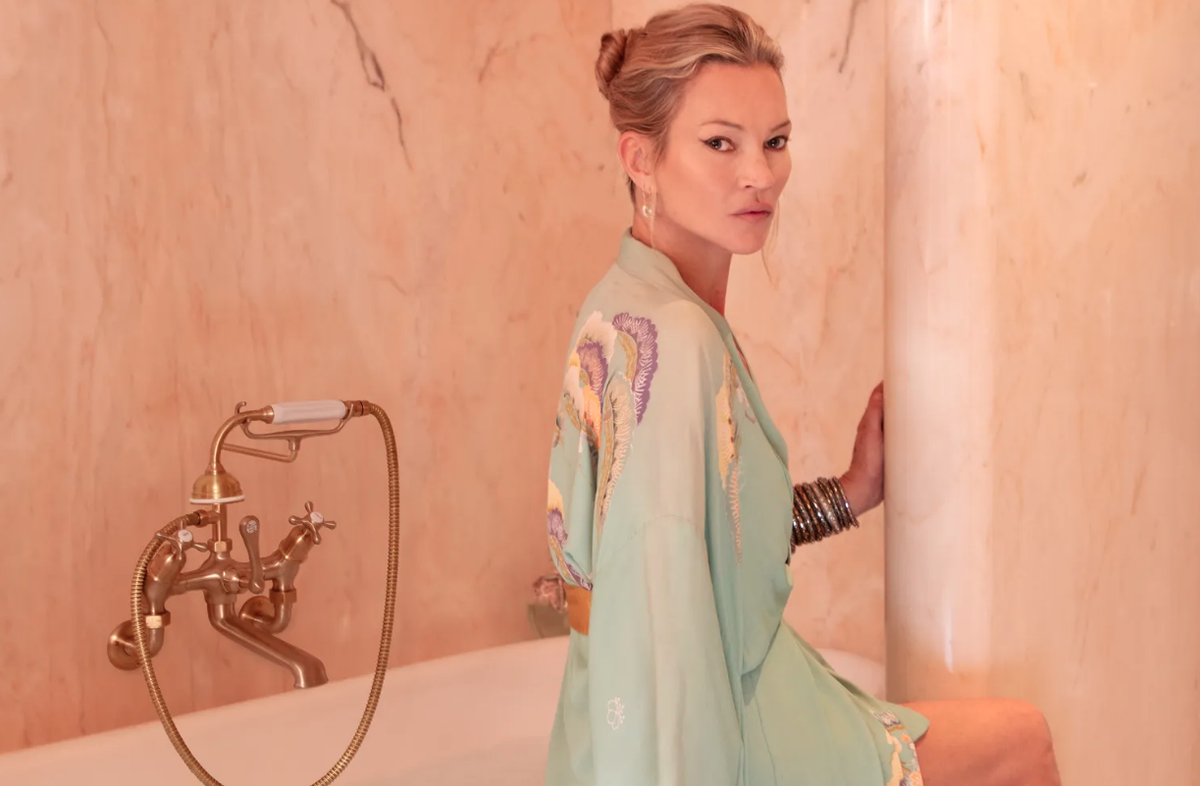 Несмотря на роскошные детали, ванная комната Кейт Мосс остаётся глубоко личной, во многом благодаря шторам, сшитым из винтажных свадебных сари, подаренных индийской подругой 20 лет назад. «Эти шторы были взяты из бывшего дома Кейт и полностью видны на фотографиях обоев « Anemones in Light» от De Gournay, созданных совместно. Они были переработаны под интерьер, как и несколько других тканей из её старого дома. Эти знакомые детали создают единое целое».