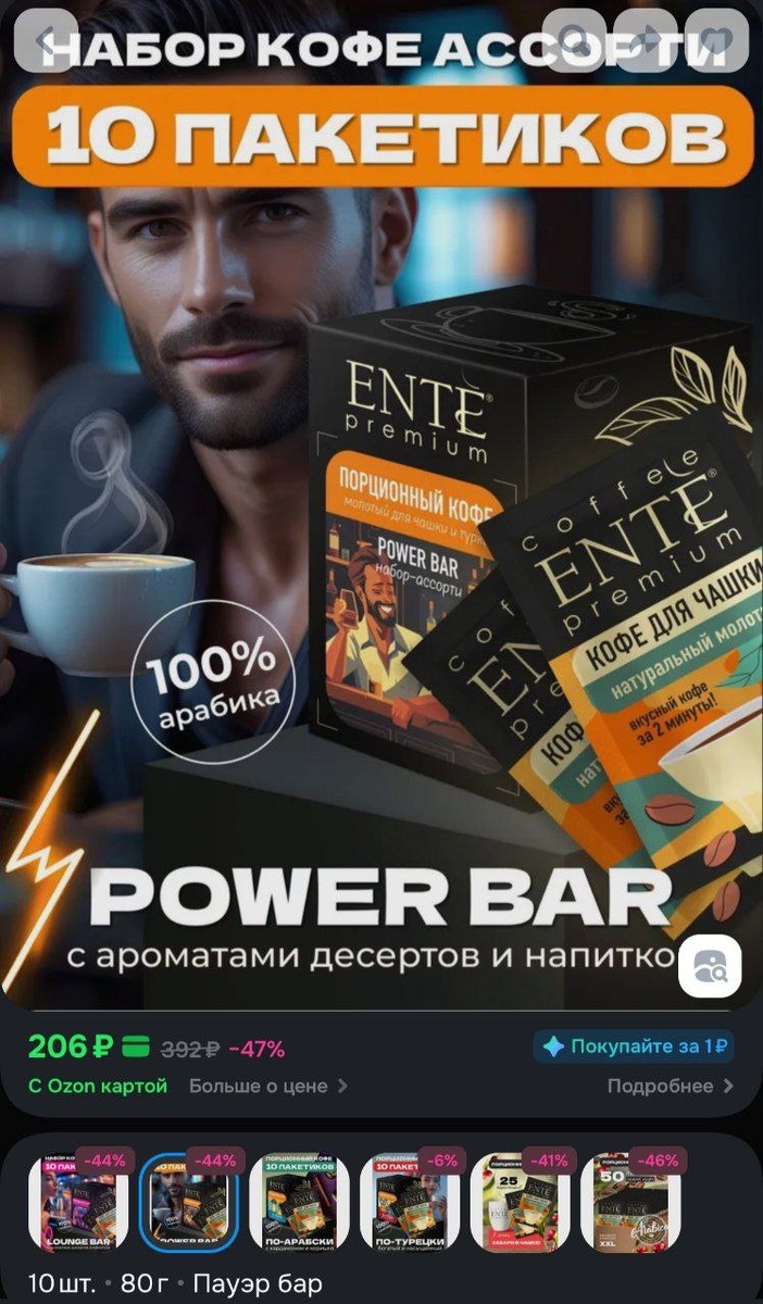 Набор порционного кофе Power bar ENTE 80 г, 10 пакетиков за 206₽ https://ozon.ru/t/LtoQ2DH