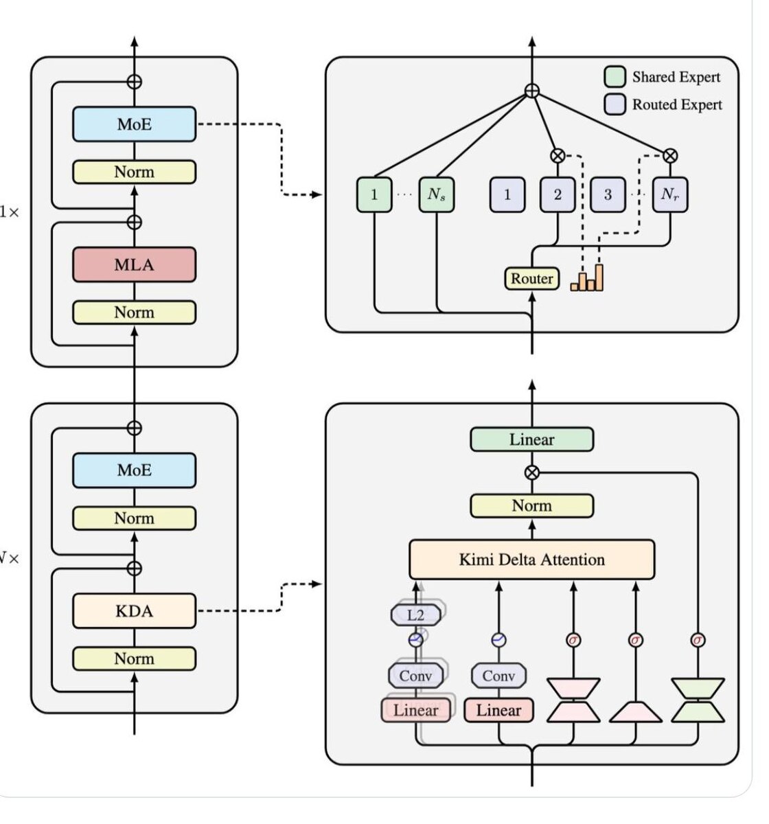 - гибридный подход: Kimi Delta Attention + MLA