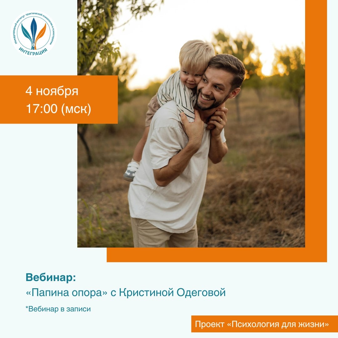 Про роль мамы широко известно, а вот про папу говорят и пишут нечасто. Какую же роль папа играет в нашей жизни? Вам интересно, как отношения с папой влияют на те сферы жизни, которые есть сейчас? Это и про границы, активность, порядок, силу, дисциплину, закон. Про опоры. Про уверенность в себе, защищённость, социальную адаптацию, реализацию, амбиции, смыслы жизни, деньги. Папа транслирует ребенку послание: «Мир на твоей стороне. Ты в безопасности». На вебинаре «Папа опора» с Кристиной Одеговой вы узнаете: 🔸 можно ли найти смысл жизни, если это никак не получается; 🔸 как быть социально активным, уверенным в себе; 🔸 что делать, если вы столкнулись с трудностями при выборе партнера, в общении с родительской или своей семьёй; 🔸 что означает, если в вашем восприятии папа «хороший», а мама – «плохая». Или наоборот. 🗓🛎 4 ноября в 17:00 мск, в рамках проекта еженедельные вебинары по подписке «Психология для жизни». 👉 Регистрация