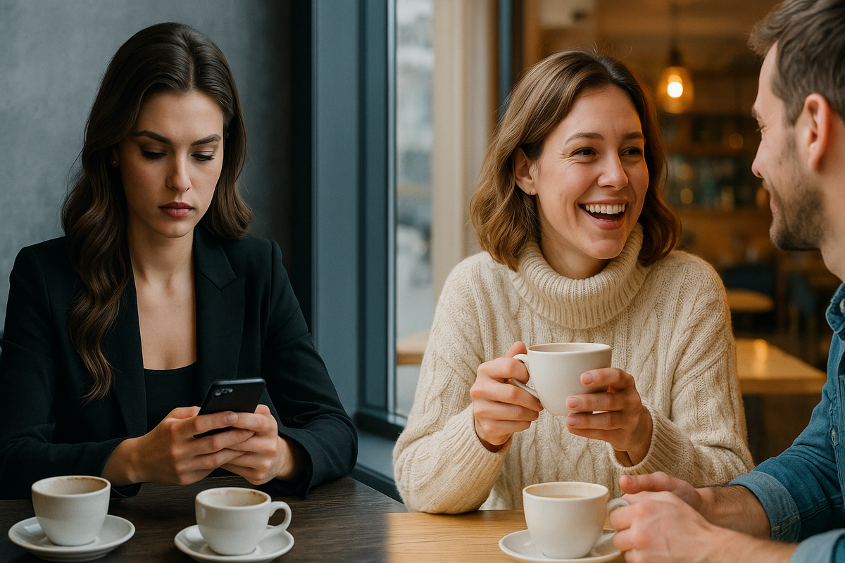 Марина - эффектная, с безупречным маникюром, гардероб как из съёмочной площадки. И… тишина в переписках через два дня. Ира - соседка в простом свитере, смешно смеётся, умеет слушать, говорит «не знаю» без страха. Вокруг неё всегда кто-то задерживается на «ещё чашку чая».