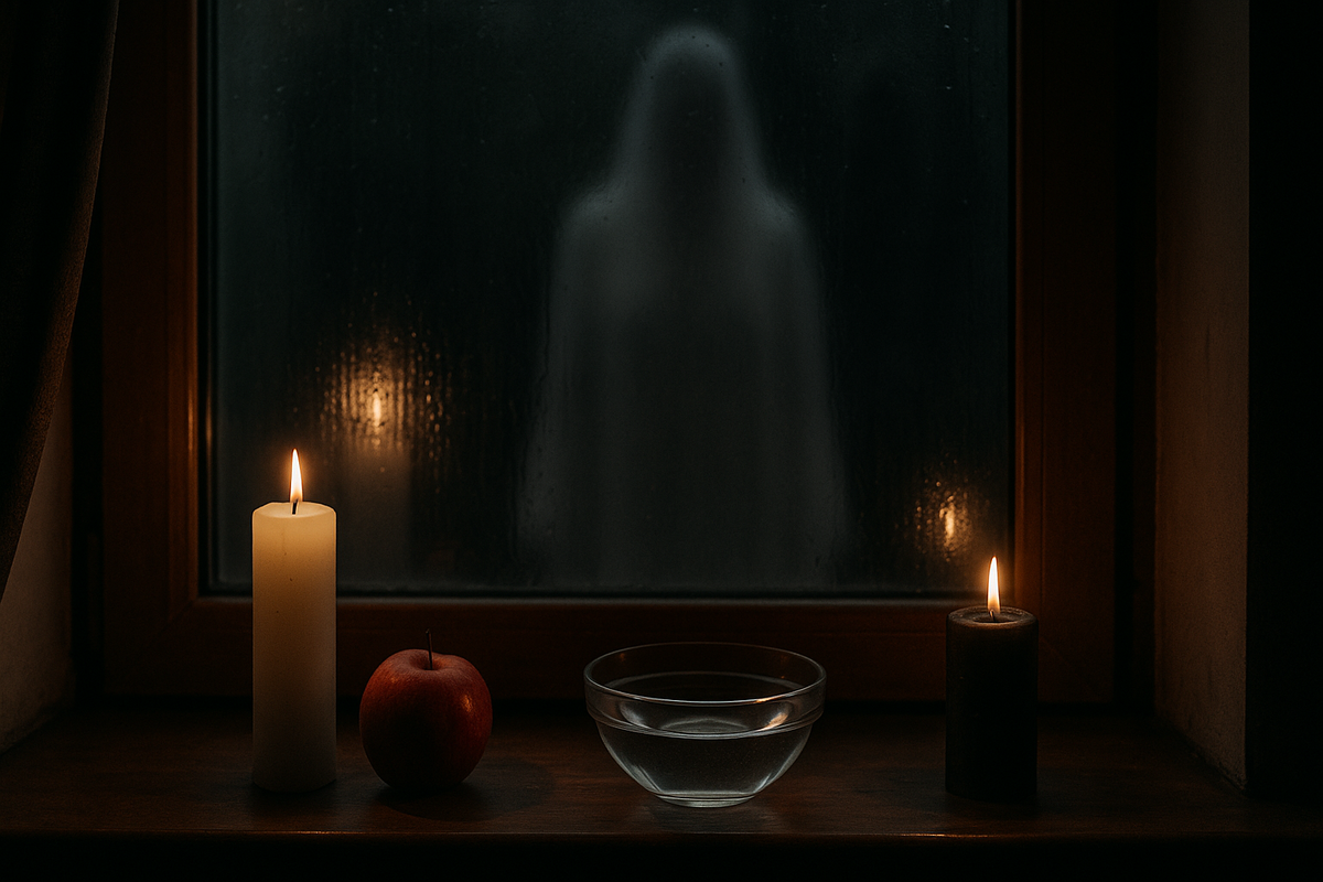 Дары предкам. Яблоко (знание, «нить судьбы»), гранат (порог, глубина), хлеб и мёд (сытость и достаток), вода/вино (чаша пути). В домашней практике достаточно малого: кусочек хлеба, ложка мёда, яблоко, стакан воды. Это знак связи, а не «жертва».
