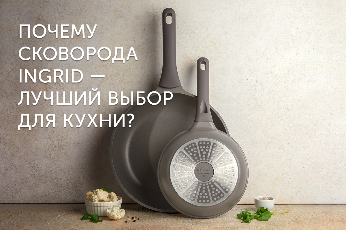 Кто бы что ни говорил, готовить важно не только вкусно, но и комфортно, удобно и безопасно. Ведь если кулинарный процесс не доставляет удовольствия, то он превращается в рутину, согласны? На хорошей сковороде легче и приятнее готовить как простые, так и сложные блюда. На качественной сковороде риск испортить блюдо сводится к минимуму. Сковороды NADOBA коллекции Ingrid – идеальный выбор для ежедневного использования, сочетающий в себе функциональность, практичность, удобство и стильный дизайн. Спасаемся от рутины красиво!) Почему надо обратить внимание на сковороды NADOBA коллекции Ingrid? Сковороды серии Ingrid созданы в самых популярных и комфортных размерах для приготовления блюд на разное количество человек: 20, 24, 26 и 28 см. Яичница на завтрак для одного или овощное рагу на ужин для всей семьи – практичность в действии. Сковороды имеют стильный кофейный оттенок, сочетающийся с дизайном любой кухни. Эргономичная ручка в цвет сковороды с покрытием «софт-тач» приятна наощупь и безоп