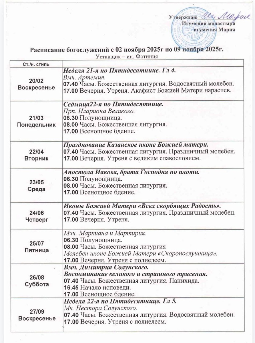 02-09.11. Расписание богослужений в Введенском женском монастыре г. Иваново