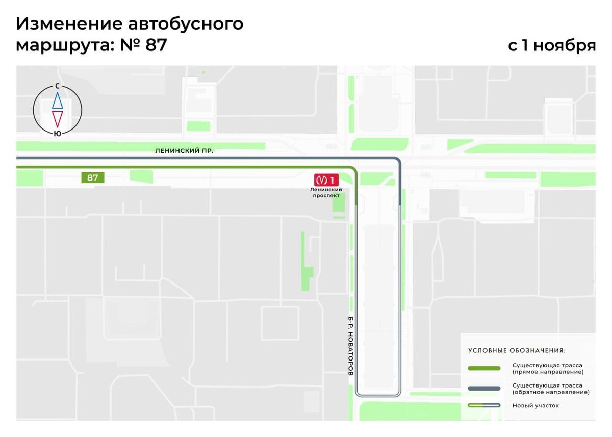 «В прямом направлении – по действующей трассе до Ленинского проспекта, далее бульвар Новаторов до конечной остановки «Станция метро «Ленинский проспект», – говорится в сообщении. – В обратном направлении – от конечного пункта по бульвару Новаторов, Ленинский проспект, далее по действующей трассе».