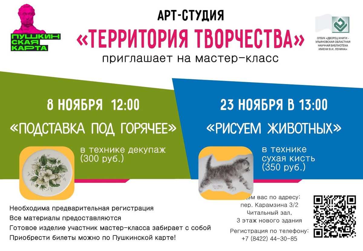 🧶Любите творчество и рукоделие? Хотите провести время интересно, с пользой? Этот мастер-класс именно для ВАС! 🎨 8 ноября в 12:00 АРТ-студия "Территория творчества" проведет мастер-класс «Подставка под горячее» в технике декупаж. ☕️ Подставка служит универсальным украшением - на неё можно поставить как чайник, полный ароматного чая, так и любую другую посуду. На мастер-классе каждый сможет создать полезный аксессуар для дома! 😍 Все материалы предоставляются организаторами. Готовое изделие участники мастер-класса забирают с собой. ✴️ Стоимость участия — 300 рублей с человека. Купить билеты Приобрести билеты можно по Пушкинской карте! 🎫 ОБРАТИТЕ ВНИМАНИЕ! Необходима предварительная регистрация! Телефон для справок и регистрации: 8(8422)44-30-85 – Читальный зал Дворца книги. #ДворецКниги_афиша