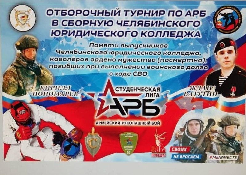 🔥Себе - честь, потомкам - память, Отечеству - слава! Это девиз армейского рукопашного боя! 💪Уже в 8 ноября 2025 года сильнейшие бойцы ЧЮК сойдутся в бескомпромиссных поединках и смогут доказать, что достойны представлять наш колледж на соревнованиях по военно-прикладному виду спорта. Турнир проводится в память о Кирилле Пономарёве и Ждане Ватутине, выпускниках Челябинского юридического колледжа, участниках СВО, кавалерах ордена Мужества (посмертно) . 🥊Ты сильный, смелый, мужественный? Тогда заполни Яндекс-форму до 5 ноября, прими участие в турнире и, одержав победу, стань легендой колледжа. 👉 ПОДАЙ ЗАЯВКУ ДО 5 НОЯБРЯ 2025 года https://forms.yandex.ru/u/69033840e010db8f743f3453/ 📌Начало соревнований 8 ноября в 10:00. ✅Взвешивание спортсменов 6-7.11.2025 год с 08:30 до 12.00 (медкабинет, 2 этаж, возле 212 аудитории) ✅Допуск спортсменов: 7 ноября 2025 с 12-00 до 14.00 (спорткомплекс). Мы ждём тебя - чемпион!