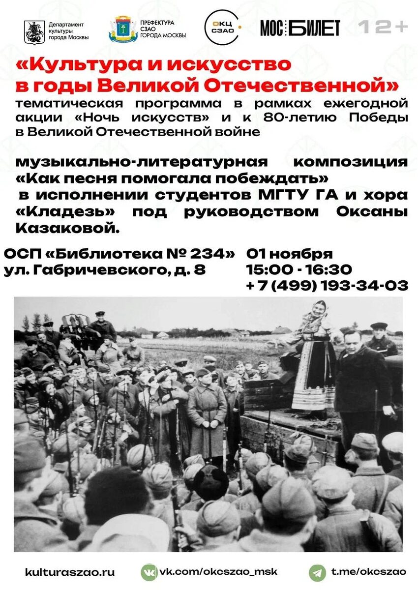 🎨 Тематическая программа “Культура и искусство в годы Великой Отечественной” 🇷🇺 📍 Библиотека №234 (ОКЦ СЗАО) ул. Габричевского, д. 8, Покровское-Стрешнево, СЗАО 🗓 1 ноября 2025 🕒 15:00–20:00 💥 Вход свободный | ☎️ +7 (499) 193-34-03 🔗 Регистрация ✨ В рамках акции #НочьИскусств и к 80-летию Победы библиотека №234 приглашает на тематическую программу «Культура и искусство в годы Великой Отечественной» — путешествие в мир героического искусства, рожденного на фронте и в тылу. 🎭 В программе: 📚 Литература — орудие борьбы и великие произведения, вдохновлявшие страну. 🎨 Живопись и графика времён ВОВ — картины, ставшие символами мужества. 🎬 Кино — в деле защиты Родины — истории, где каждый кадр дышал верой в Победу. 🎶 Кульминацией станет музыкально-литературная композиция «Как песня помогала побеждать» в исполнении студентов МГТУ ГА и хора «Кладезь» под руководством Оксаны Казаковой. 🕊 Приходите, чтобы вспомнить, как сила искусства помогала людям выстоять, творить и верить в