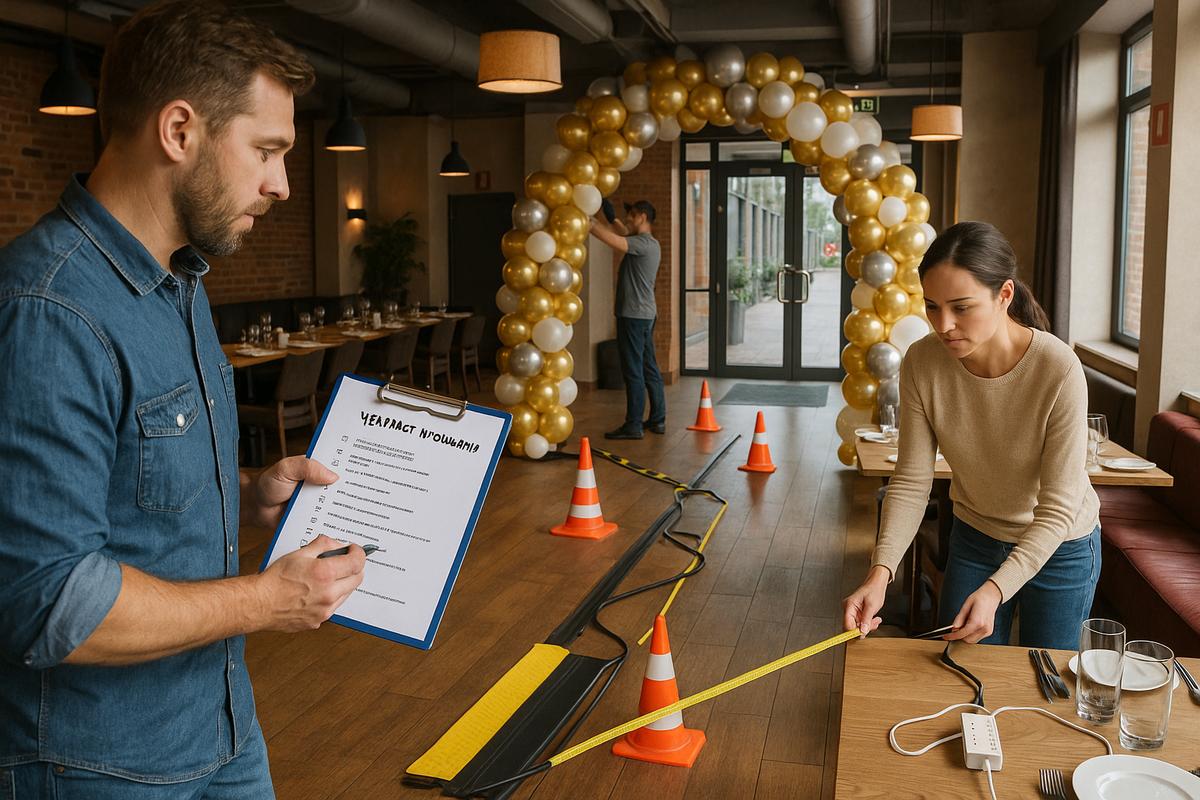 Как избежать: заранее разметьте 4 зоны: вход/приветствие, фотозона, фуд-зона, сцена/торт. Оставляйте проходы ≥ 90 см. Сделайте простой план-схему на листе. Ошибка: низкая арка в узком коридоре, гигантский фон в зале с низкими потолками, «давящая» композиция.