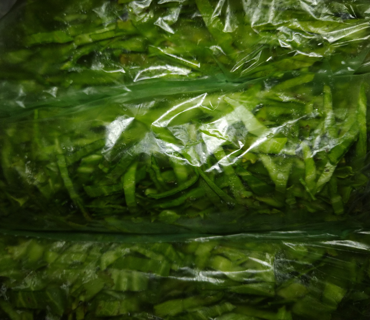 Утром нашла три кочана еще, с зелеными верхними листьями. Закатились стараниями детей. Хорошо не протухли там. Ну и куда эти листья оставшиеся деть ? Выкинуть жалко. Свое все же. Практически экологически чистое. К уже почти готовым добавлять поздно. И вот решила я их просто соломкой тоненькой нарезать и в морозилку убрать.