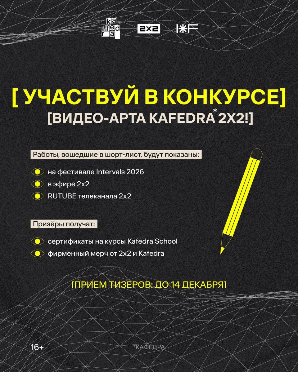 Если ты откладывал участие в «kafedra 2x2» на потом — вот твой волшебный пинок! Сбор заявок на конкурс видео-арта от Телеканала 2x2 и Kafedra School в самом разгаре. Сделай анимацию в своём стиле, залетай в эфир 2x2 и, возможно, на международный фестиваль медиаискусства INTERVALS 2026. Дедлайн приёма заявок: 14 декабря 2025. Все условия — по ссылке. Это твой шанс попасть в эфир и продемонстрировать свой уникальный стиль! СРОК ПРОВЕДЕНИЯ КОНКУРСА С 23.10.2025 ПО 01.07.2026 ВКЛЮЧИТЕЛЬНО. ПОДРОБНОСТИ НА 2x2tv.ru/kafedra2x2