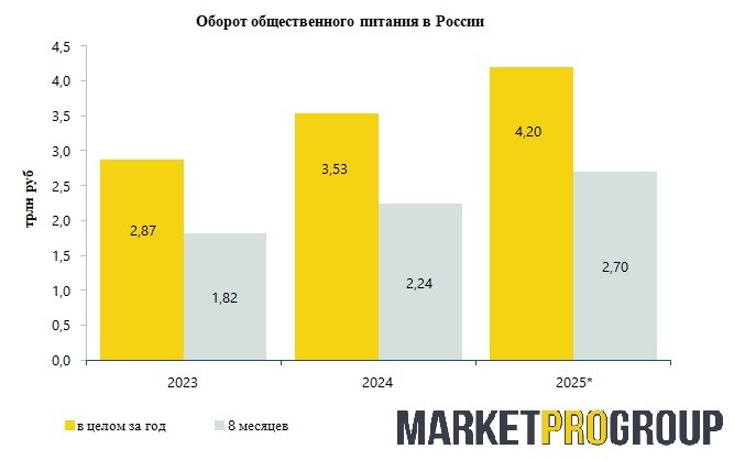 За первые восемь месяцев 2025 года выручка операторов рынка выросла на 20% в сравнении с аналогичным периодом прошлого года, составив 2,7 трлн руб. Согласно данным исследования «Анализ рынка общественного питания в России в 2025 году», подготовленного компанией MarketProGroup, по итогам 2025 года рынок общественного питания в России может составить рекордные 4,2 трлн руб. Основой значительного роста рынка в последние годы является глубокая трансформация всей индустрии: меняются как привычки гостей заведений общественного питания, так и бизнес-модели игроков. Драйвером роста рынка общественного питания стало изменение образа жизни и потребительского поведения россиян. Посещение кафе и ресторанов перестало быть исключительно праздничным ритуалом, превратившись в часть повседневной культуры. На это указывает и устойчивый рост доли трат на общепит в кошельке россиян: по оценкам экспертов, с 2020 года она увеличилась на 2,2 процентных пункта, достигнув 7%. Люди стали чаще выбирать готовую е