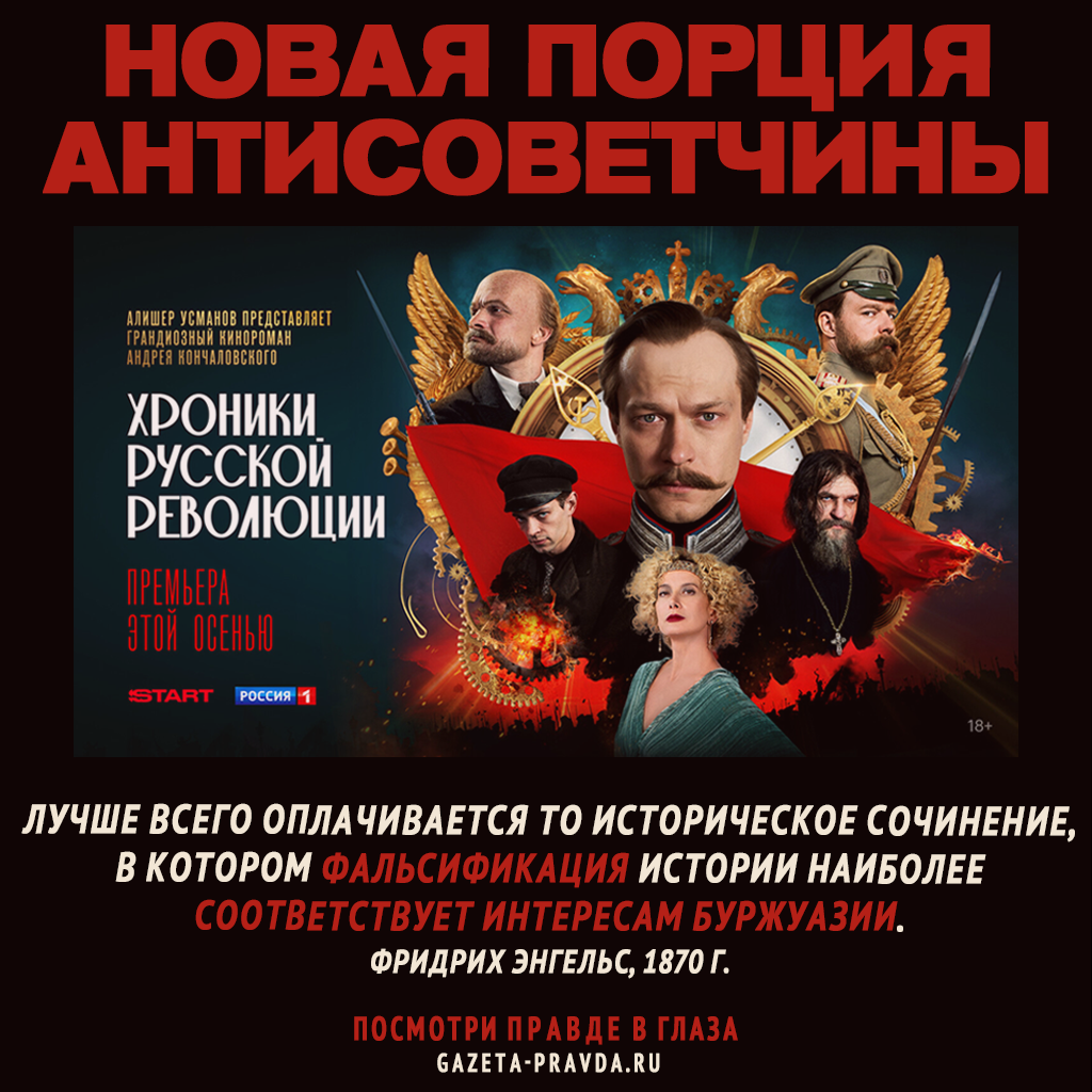 «Идёт классовая война. Ну и хорошо, ведь это мой класс, богатый класс, ведёт эту войну, и мы побеждаем». — Уоррен Баффет, миллиардер, The New York Times, 2006 г. Когда политическая жизнь закупорена, а протесты запрещены, буржуазия переносит борьбу в сферу идеологии. На смену антинародным законам приходит антисоветская пропаганда, бьющая по сознанию миллионов. После квазирелигиозной «Мумии» телеканала «Спас» на экраны вышли «Хроники русской революции» - сериал, снятый при поддержке фонда миллиардера Алишера Усманова «Искусство, наука и спорт». Режиссёр Андрей Кончаловский представил революцию как «смуту», а её вождей — как сомнительных людей. Об этом — статья секретаря по идеологии МГК КПРФ, депутата Госдумы Дениса Парфёнова «Новая порция антисоветчины», опубликованная в сегодняшнем номере «Правды». «Крупный капитал никогда не станет снимать не то что положительные, но даже нейтральные картины о революции и вожде мирового пролетариата», — подчёркивает Денис Парфёнов. Роскошная съёмка
