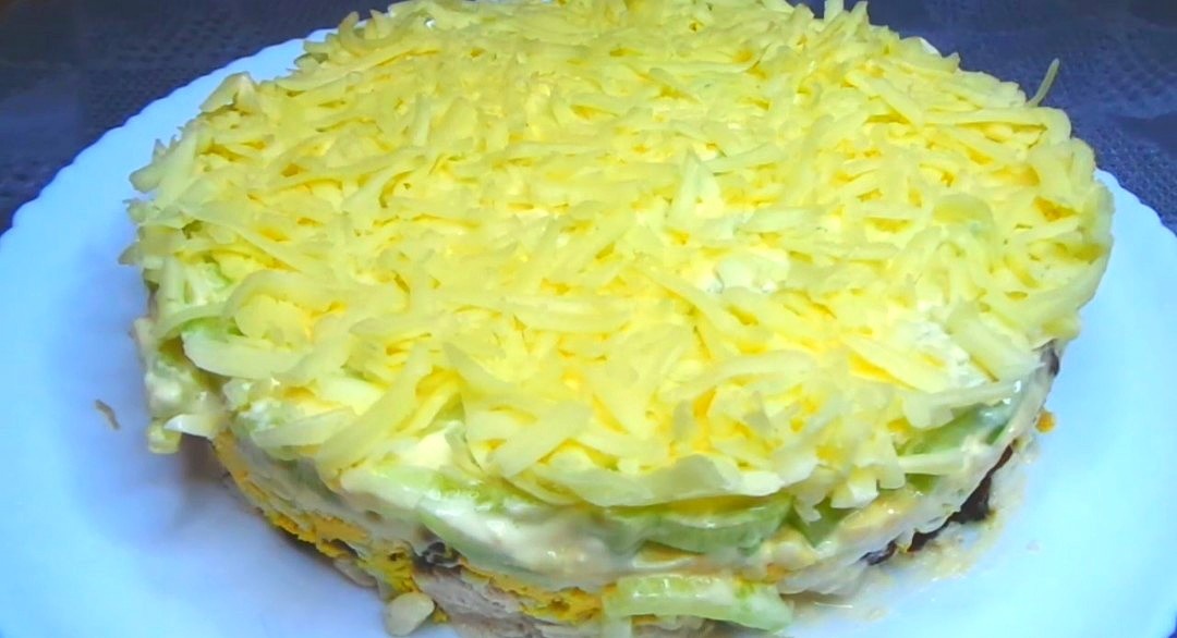=================== Куриное филе - 250 гр. Шампиньоны - 400 гр. Яйца - 3 шт. Свежий огурец - 1-2 шт. Сыр - 100 гр. Майонез по вкусу. ===================== Собираем салат в разъемной форме или кольце, но если ни того ни другого нет то можно и без них. 1-й слой: Куриное филе, разровнять, смазать майонезом. 2-й слой: Обжаренные шампиньоны, разровнять. 3-й слой: Натёртые яйца, разровнять, смазать майонезом. 4-й слой: Свежий огурец, разровнять, смазать майонезом. 5-й слой: Натереть на крупной тёрке сыр, разровнять. Поставить салат в холодильник на 1-2 часа. Спустя время достать салат, убрать разъемное кольцо(если использовали) и подать салат к столу. Такой салат можно приготовить и подать на Праздничный стол. Салат получается свежий и вкусный. Приятного аппетита.