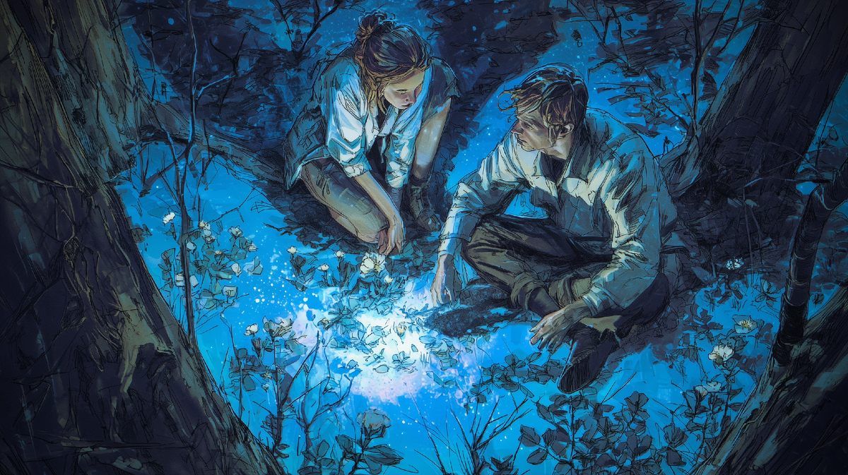 И мы бежим. Бежим через поле к лесу, где в деревьях застряло голубое сияние. Мальчишка держит меня за руку, и его ладонь горячая и влажная от волнения. Мы добегаем до края леса, и там, в небольшой воронке...