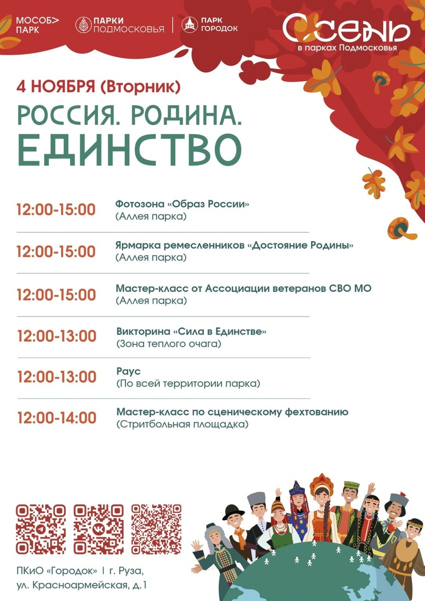 4 ноября в парке «Городок» пройдёт мероприятие «Россия. Родина. Единство». Приглашаем всех желающих на этот праздник, где каждый найдёт что-то для себя. Программа: Приходите и празднуйте единство и многообразие нашей страны вместе! Адрес: г. Руза, ул. Красноармейская, д. 1