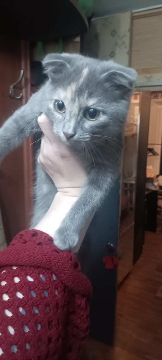 Уссурийская 5к3, в подъезде найден серый вислоухий котенок, возможно у кого-то сбежал из квартиры