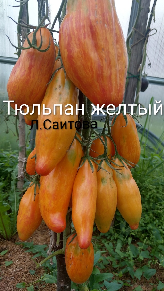 Добрый вечер, уважаемые подписчики! Сегодня хочу познакомить Вас с моими сортами Томаты из серии Тюльпан. Тюльпан желтый.Индет.Куст тонкого строения.Очень урожайный.Ярко оранжевые плоды 200-400г с малиновым разводит растут костями по 5-7шт. В этом году в кистях было по 9шт. Завязал все плоды.Мякоть плотная, биколорная,с небольшой кислинкой,почти без семян. Плоды хранятся долго Большой фестивальный тюльпан (Huge Tulip Festival)расщепление Желтого Тюльпана.Куст тонкого строения. Очень урожайный. Плоды 300-400гр желто оранжевые с ребрами. Мякоть биколорная, без пустот .семян в плодах практически нет Тюльпан зеленый.Индет.Плоды удлиненные, изумрудного цвета с извилистыми полосками красного цвета, массой 150-300 г. Мякоть изумрудная с розовым язычком, сахаристая, сбалансированного вкуса. Семян в плодах очень мало. Сорт очень урожайный, весь увешан плодами. Большой Фестивальный Тюльпан Зеленый. Расщепление от биколорной версии этого сорта Индет, Среднеспелый Крупные красивые сердца 300-5