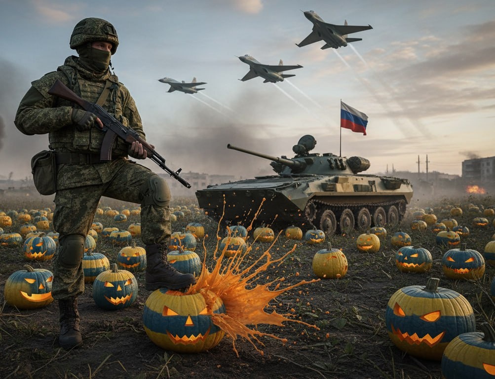 В конкурсе на лучший костюм к Хэллоуину побеждает костюм Крутого Парня. Правда, конфетками тут ничего не решишь, поэтому всем тыквоголовым в эту ночь предлагается сложить оружие, поднять руки и медленно следовать в сторону Российской Федерации. 🇷🇺 Умельцы-Фронту