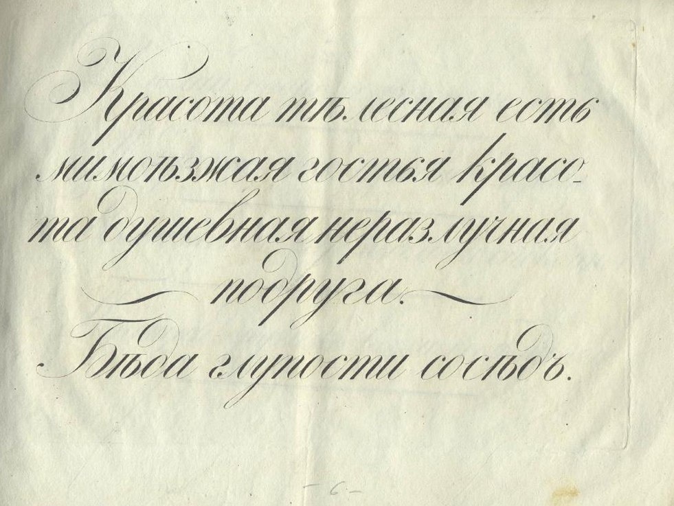 «Красота телесная есть мимоезжая гостья, красота душевная — неразлучная подруга. Беда глупости сосед». Повторяя на письме такие фразы, учились чистописанию школьники в России начала XIX века. Из пособия М. Брифа «Российские прописи для чистописания» 1831 года.