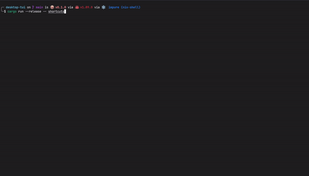 Desktop-TUI — это минималистичная среда рабочего стола в терминале, созданная на языке Rust. Она позволяет управлять окнами, запускать приложения и команды в текстовом интерфейсе, предоставляя функционал, схожий с оконным менеджером, но без графической оболочки. * Анализ файлов ярлыков: поддержка конфигурационных файлов (в формате TOML), содержащих описание приложений, их команд и аргументов. * Пользовательские команды: можно добавить собственные действия — например, «Открыть файл» или «Открыть папку». * Настройки окон: поддерживается изменение размеров, фиксированное положение и кнопка закрытия. * Настройки терминала: изменение отступов, цвета фона и других параметров интерфейса. * Отображение вывода приложений: любая команда, использующая стандартный вывод, может быть запущена и выведена в отдельное окно. * Работа с окнами: можно перемещать и изменять размер окон прямо в терминале. * Обработка ошибок: при сбое программы Desktop-TUI отображает сообщение об ошибке. * Дополнительные фун