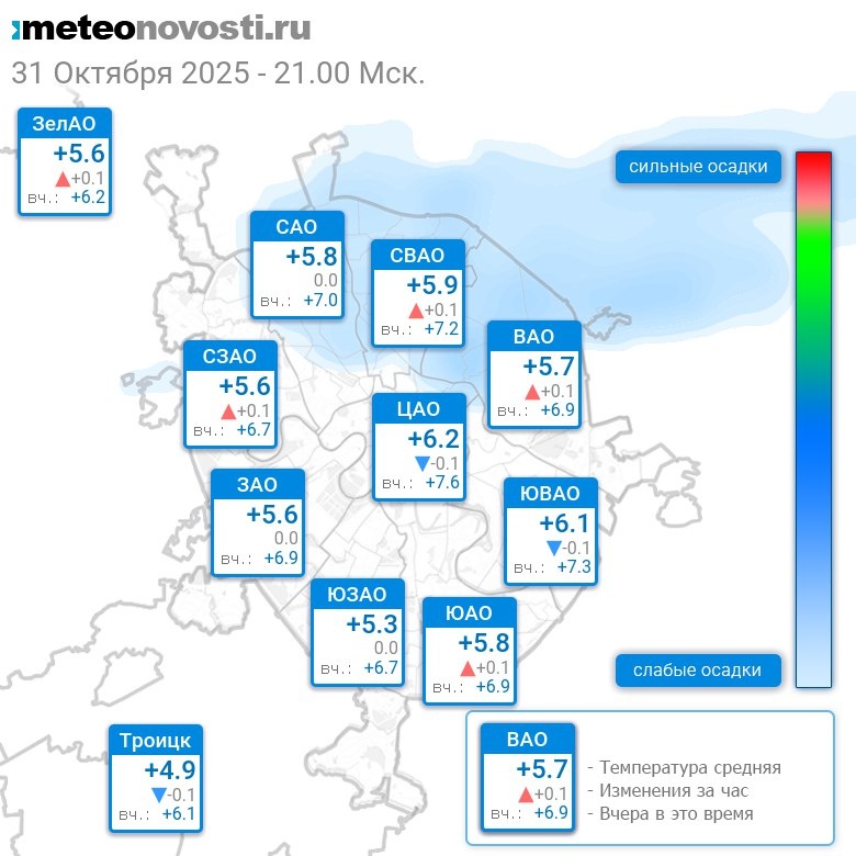В 21:00 в Москве было от +4.8°C до +6.5°C, средняя температура +5.8°C #погода #Москва #осень #температура #31октября #пятница Перейти на сайт Прогноз погоды на 14 дней