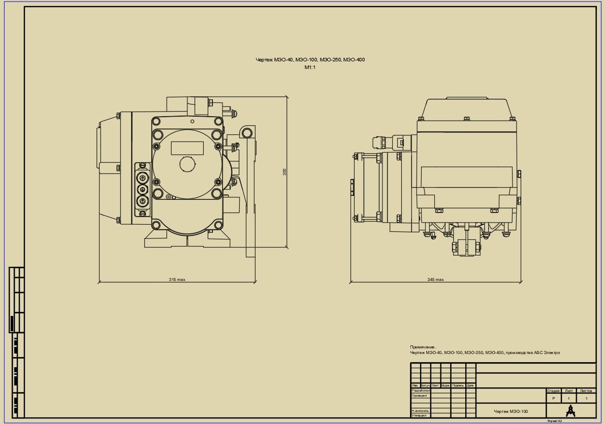 МЭО‑100 — это электрический однооборотный исполнительный механизм (ЭИМ), предназначенный для дистанционного или автоматического управления запорно‑регулирующей трубопроводной арматурой (шаровыми кранами, дисковыми затворами и т. п.) в системах промышленной автоматики. Перемещение регулирующих органов в системах автоматического регулирования технологическими процессами по командным сигналам от управляющих устройств. · Номинальный крутящий момент на выходном валу: 100 Н·м. · Питание: o трёхфазное: 380 В, 400 В, 415 В (50 Гц) или 380 В (60 Гц); o однофазное: 220 В, 230 В, 240 В (50 Гц) или 220 В (60 Гц). · Степень защиты: IP54 (защита от пыли и брызг воды). · Температурный диапазон эксплуатации: от −40 °C до +55 °C (климатическое исполнение «У2») или от −10 °C до +50 °C (исполнение «Т2»). · Режим работы: повторно‑кратковременный (S4) с ПВ до 25 %, частотой включений до 320 в час. · Гарантия: 1,5 года. · Срок службы: не менее 15 лет. · синхронный электродвигатель; · червячный редуктор; · р