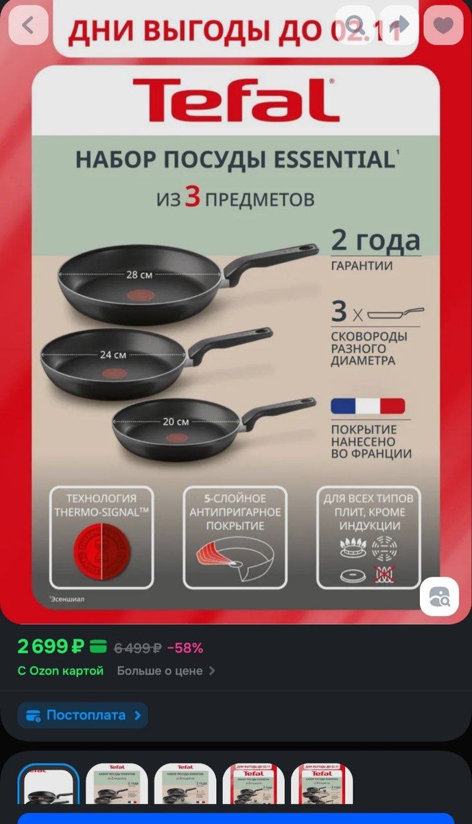 Набор сковород Tefal Essential, 3 предмета: 20, 24, 28 см, с индикатором нагрева, антипригарным покрытием, подходит для газовых, электрических и стеклокерамических плит за 2699₽ https://ozon.ru/t/yni7Bnn