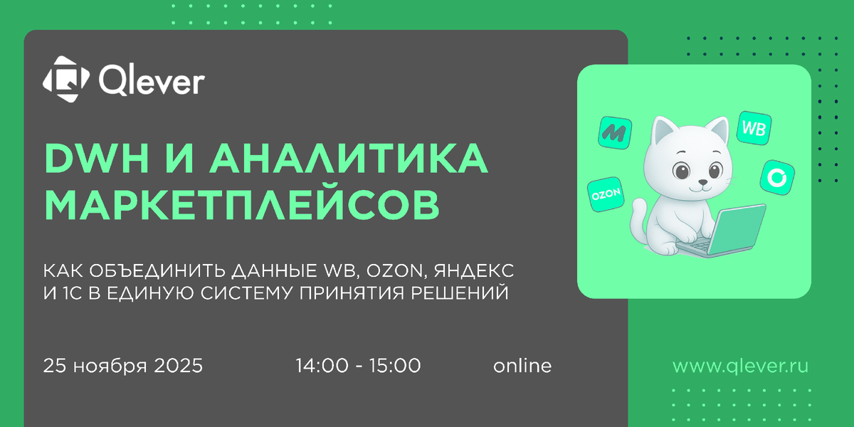 С ростом бизнеса Excel и готовые онлайн-сервисы аналитики MPStats, Radar, MPFact, PiData, Nepsell перестают справляться с аналитикой: Решить все эти задачи поможет внедрение корпоративного хранилища данных DWH в связке с дашбордами в BI. Подключайтесь к вебинару Qlever Solutions DWH и аналитика маркетплейсов и узнайте, зачем крупным селлерам нужен DWH и наглядные дашборды в BI 🗓 25 ноября 🕑 14:00 МСК 💻 online ЗАРЕГИСТРИРОВАТЬСЯ Проще говоря: