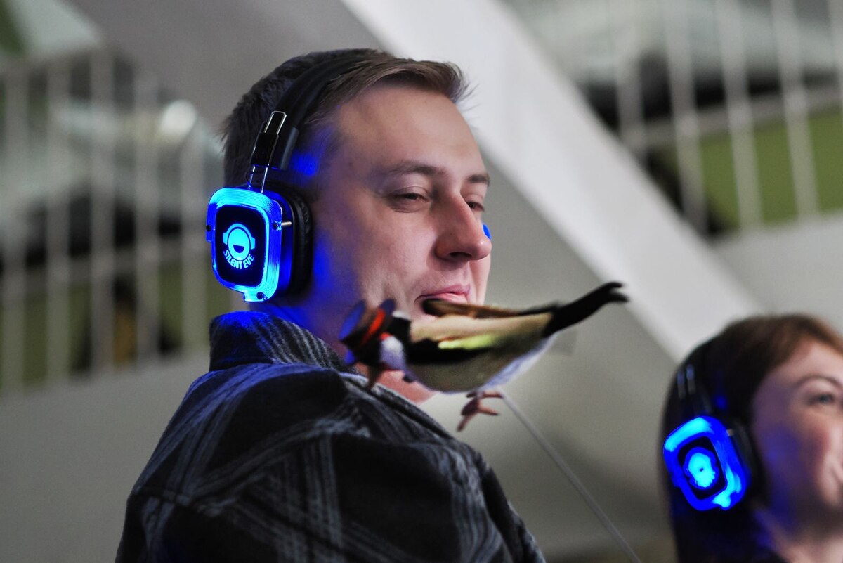 В фойе гаснет свет, и в наушниках звучит негромкий птичий щебет. Как будто по колоннам и люстрам деловито снуют невидимые воробьи, синицы и поползни. Им и зрителям искренне улыбается Орнитолог, появившийся из светотеней, и жестом приглашает идти следом.