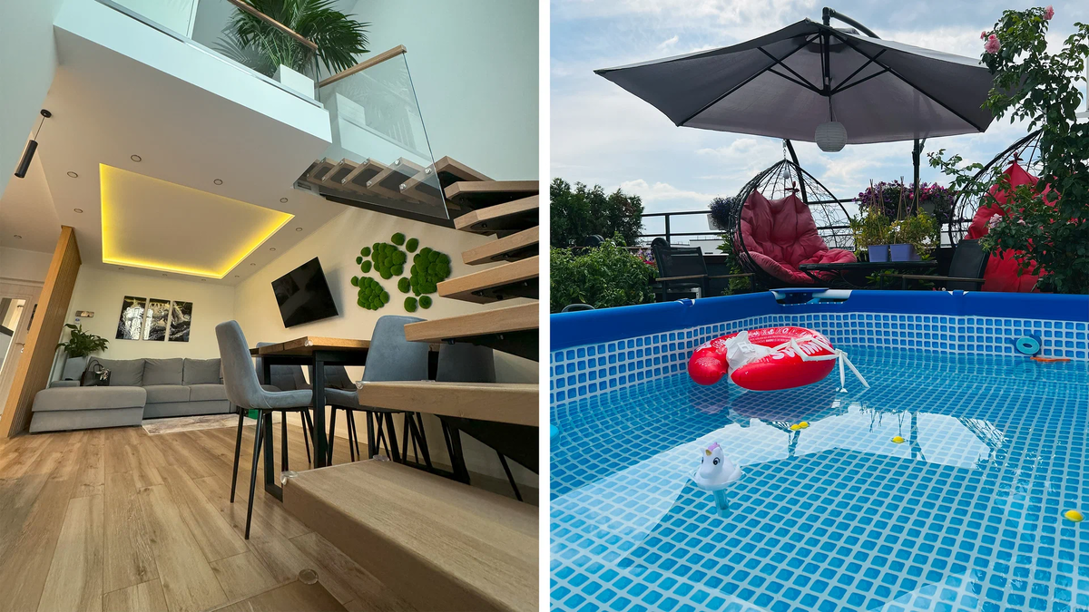 Сначала мы поставили наверху столик и кресла, потом увлеклись — захотелось уюта и зелени. Я привезла пару туй, а чтобы их поливать, протянула с первого этажа длинный шланг. И вот в особенно жаркое лето, подумала: «А почему бы не поставить бассейн?» Купили сначала надувной, потом каркасный и кайфовали прямо под открытым небом.