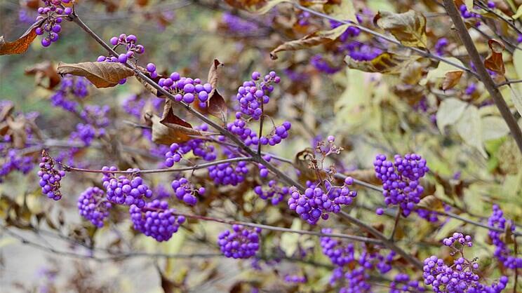 - Callicarpa bodinieri (красивоплодник Бодинье)‘Profusion’ — классика жанра: мощные кисти густо-фиолетовых ягод, куст 2–3 м, устойчив, один из самых обильных.
